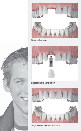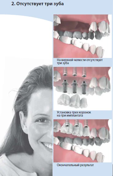 1.Имплантами можно замещать отсутствующий зуб без препарирования (обточки) соседних зубов, т.е. ранее для восстановления одного отсутствующего зуба обтачивались два соседних зуба для изготовления мостовидного протеза.